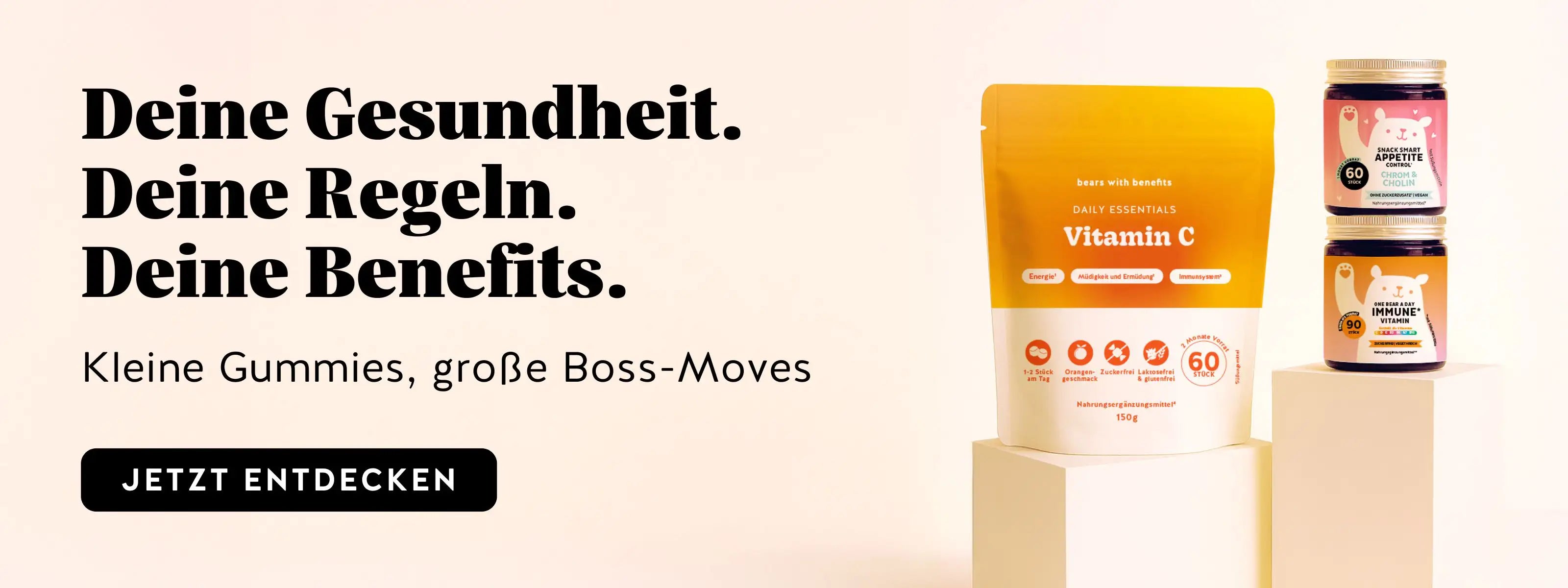 Herzlich willkommen bei Bears with Benefits – Deinen Experten für leckere und effektive Nahrungsergänzungsmittel. Wir verzichten auf öde Pillen oder Kapseln und haben unsere hochwertigen Inhaltsstoffe in kleine Gummibärchen gepackt! Ausserdem sind die meisten unserer Bärchen vegan und natürlich absolut frei von Tierversuchen. Zusammen mit der Ernähurngsmedizinerin Dr. Med. Anne Latz und der Ernährungs-Wissenschaftlerin Nassim Jamalzadeh entwickeln wir unsere Produkte stetig weiter um Dir das höchste Maß an Qualität zusichern zu können. Bei uns findest Du eine breite Auswahl an Produkten, die speziell auf Deine Bedürfnisse zugeschnitten sind. Egal, ob Du etwas für Deine Haare, Deine Haut oder Deine allgemeine Gesundheit suchst – wir haben das passende Produkt für Dich.